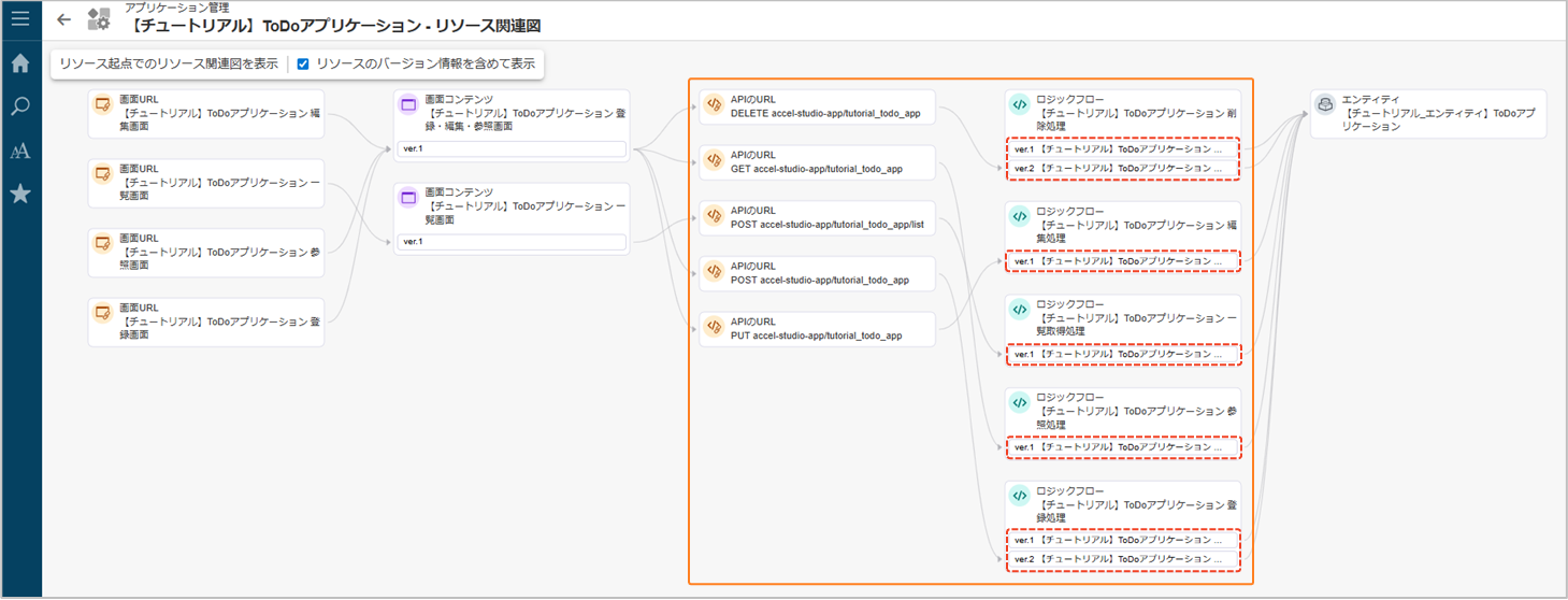 フロールーティング定義(APIのURL)は、特定のロジックフロー定義とそのバージョンに紐づいています(リソース関連図で確認できます)。