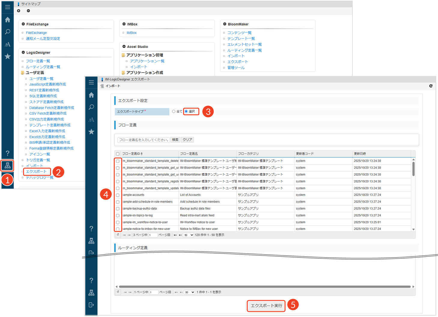 └ 各定義情報(フロー定義・ルーティング定義・ユーザ定義・トリガ定義)の一覧が表示されます。 - エクスポートしたいフロー定義にチェックを入れます。