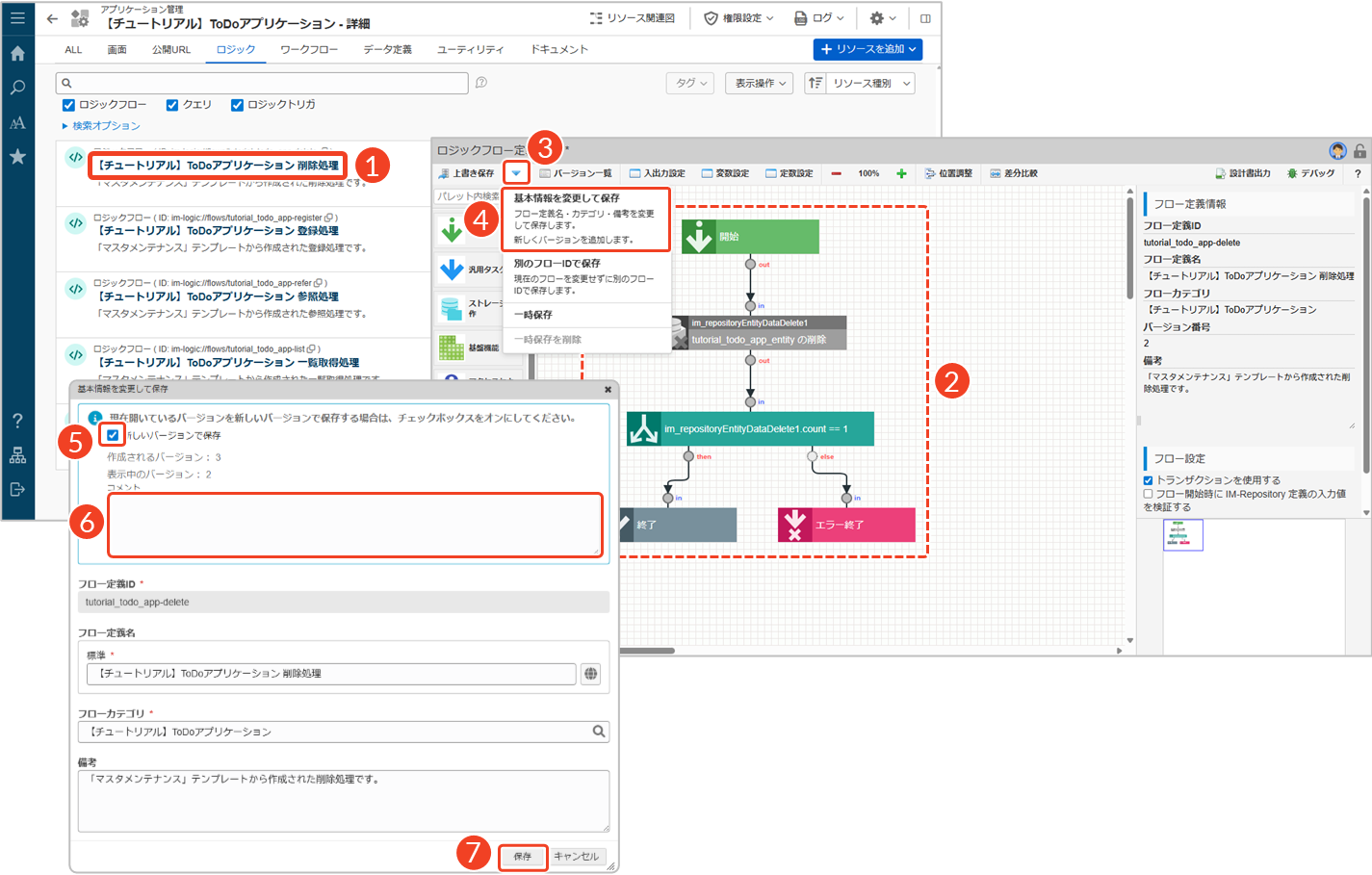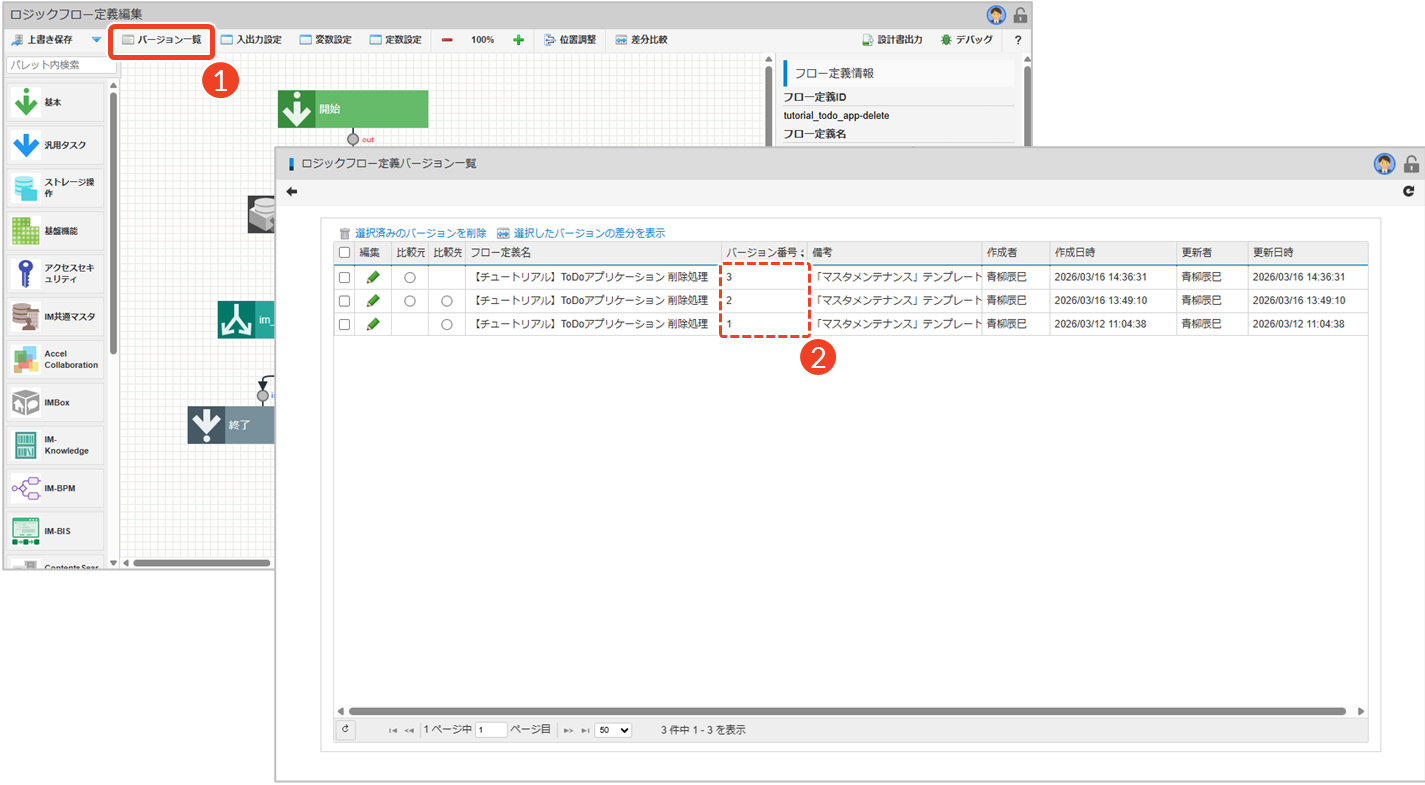 バージョン管理の仕組みや差分比較の方法については、「ロジックフローの編集」を参照してください。