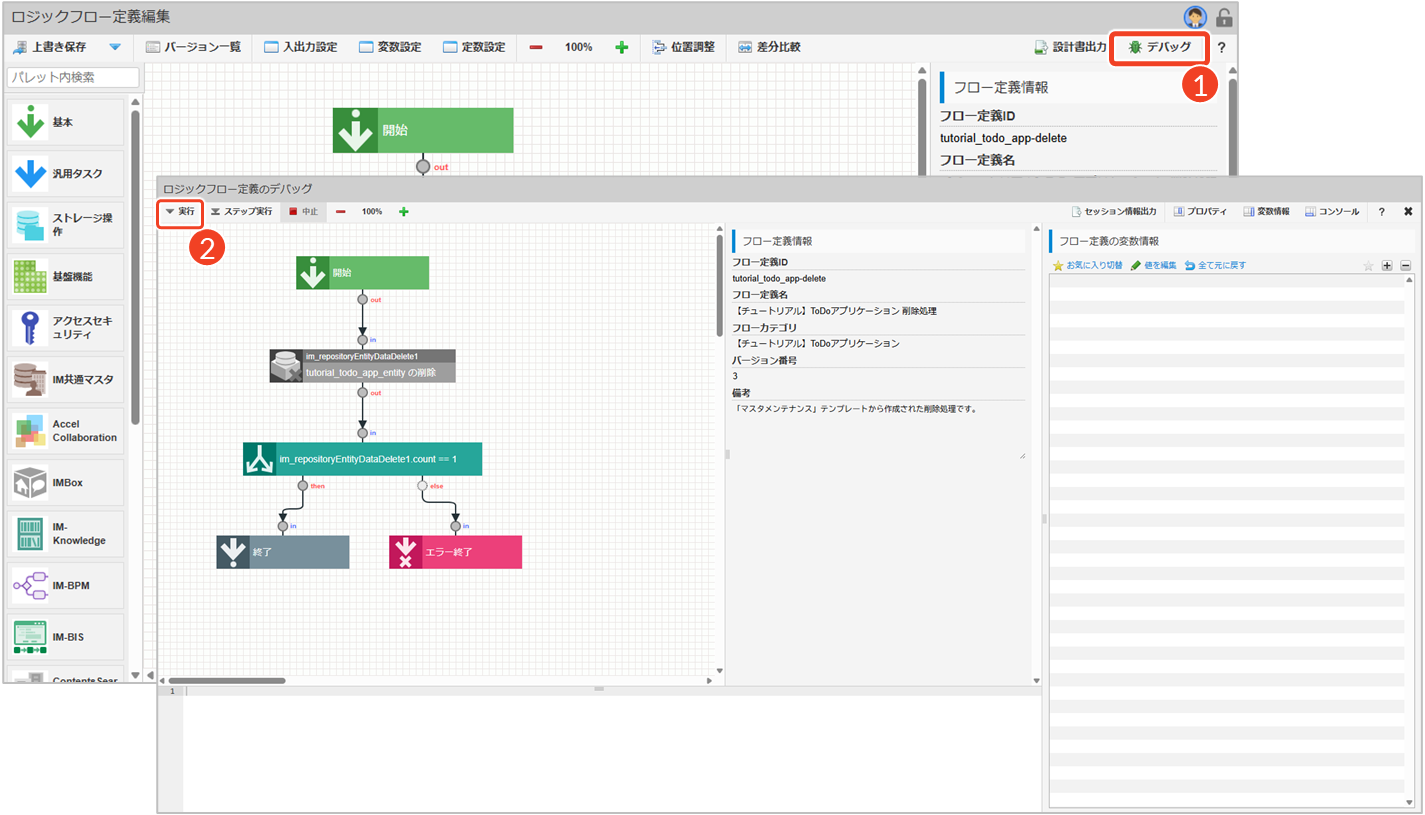 必要に応じて、ステップ実行・ブレイクポイント・値の確認などの機能を使い、意図通りに動作するかを検証します。詳細は「ロジックフローのデバッグ > 応用操作」を参照してください。