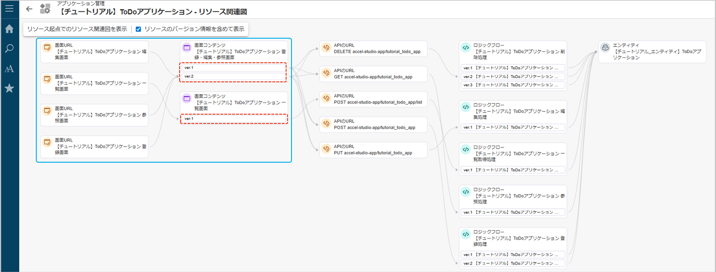 画面のルーティング定義(画面URL)は、特定の画面コンテンツ定義とそのバージョンに紐づいています(リソース関連図で確認できます)。