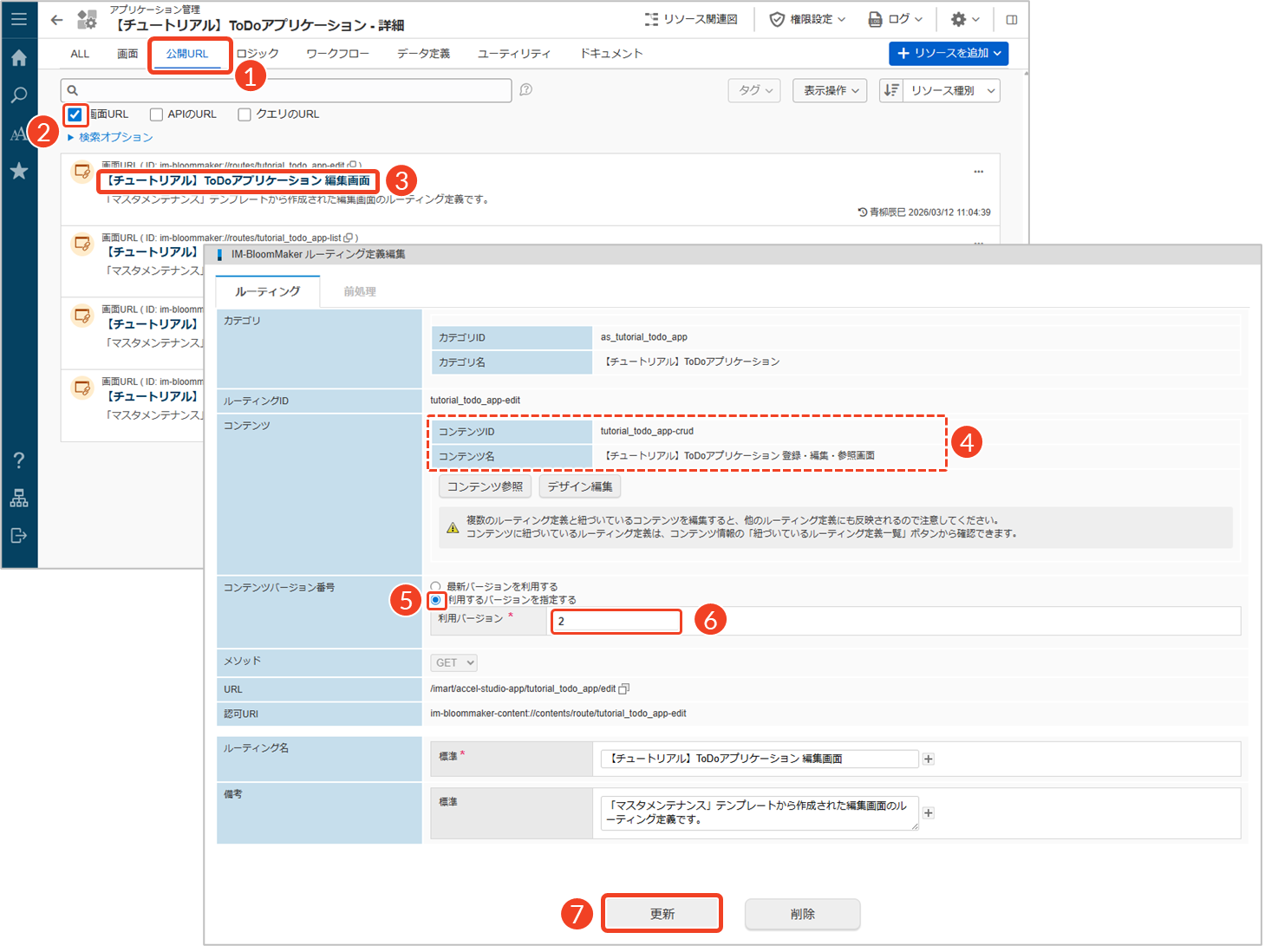 ルーティング(画面URL)に紐づいている画面コンテンツのバージョンを、修正済みのバージョンに変更します。