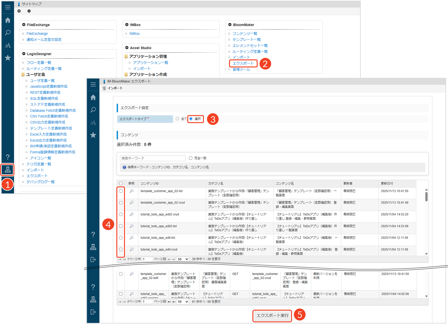 └ 「サイトマップ」画面が表示されます。 - 「BloomMaker」にある[エクスポート]をクリックします。
