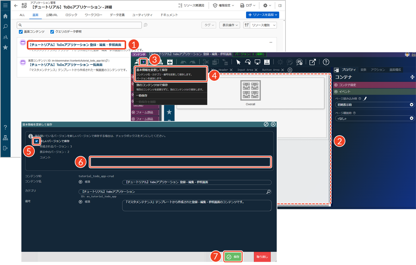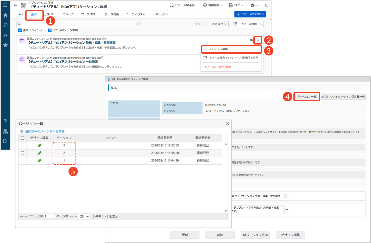 - バージョン3:編集した画面が新しいバージョンとして保存されています。