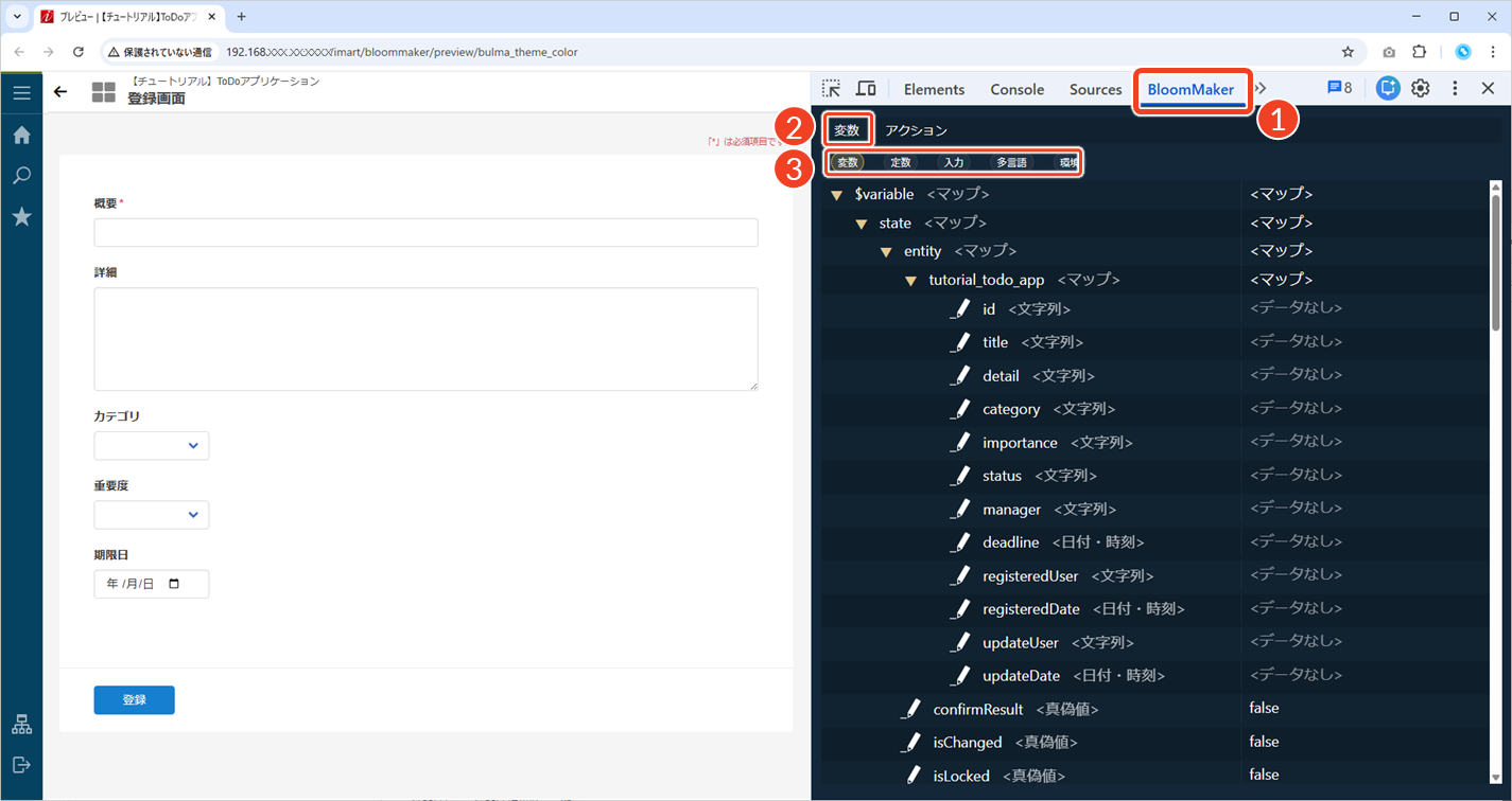 | 入力フォームやラベルの変数バインド | IM-BloomMakerの変数が、IM-Repositoryの辞書項目やエンティティと正しく連携しているかを確認します。IM-Repositoryのタスク一覧を活用してください。 | 「タスク一覧を表示する」 |