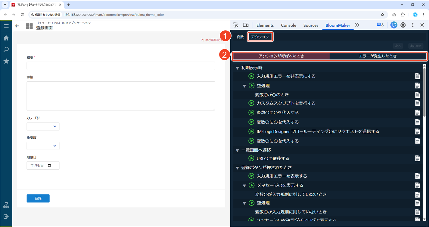 | 画面読み込み時やボタンの押下時などのイベントに設定されているアクションで、変数の値やデータ連携処理を修正します。 | 「IM-BloomMakerのアクション」 | |