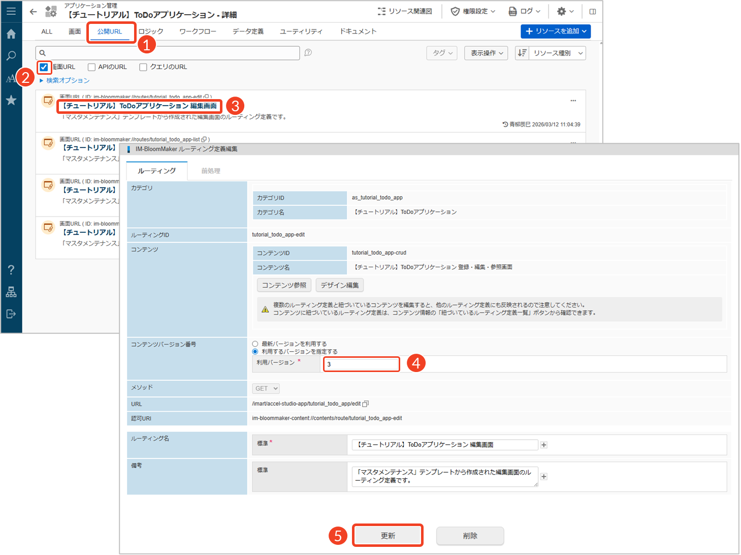 ルーティング(画面URL)に紐づいている画面のバージョンを、バージョン2から修正済みのバージョン3に変更することで、編集内容をアプリケーションで利用できるようになります。