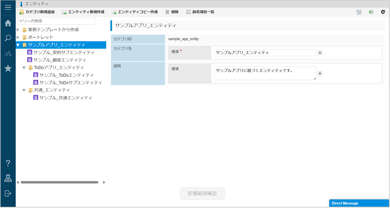 必要に応じて、「データ定義」リソースとして追加した辞書項目やエンティティを修正します。データの新規作成で対応できなかった設定については、ここで修正できます。