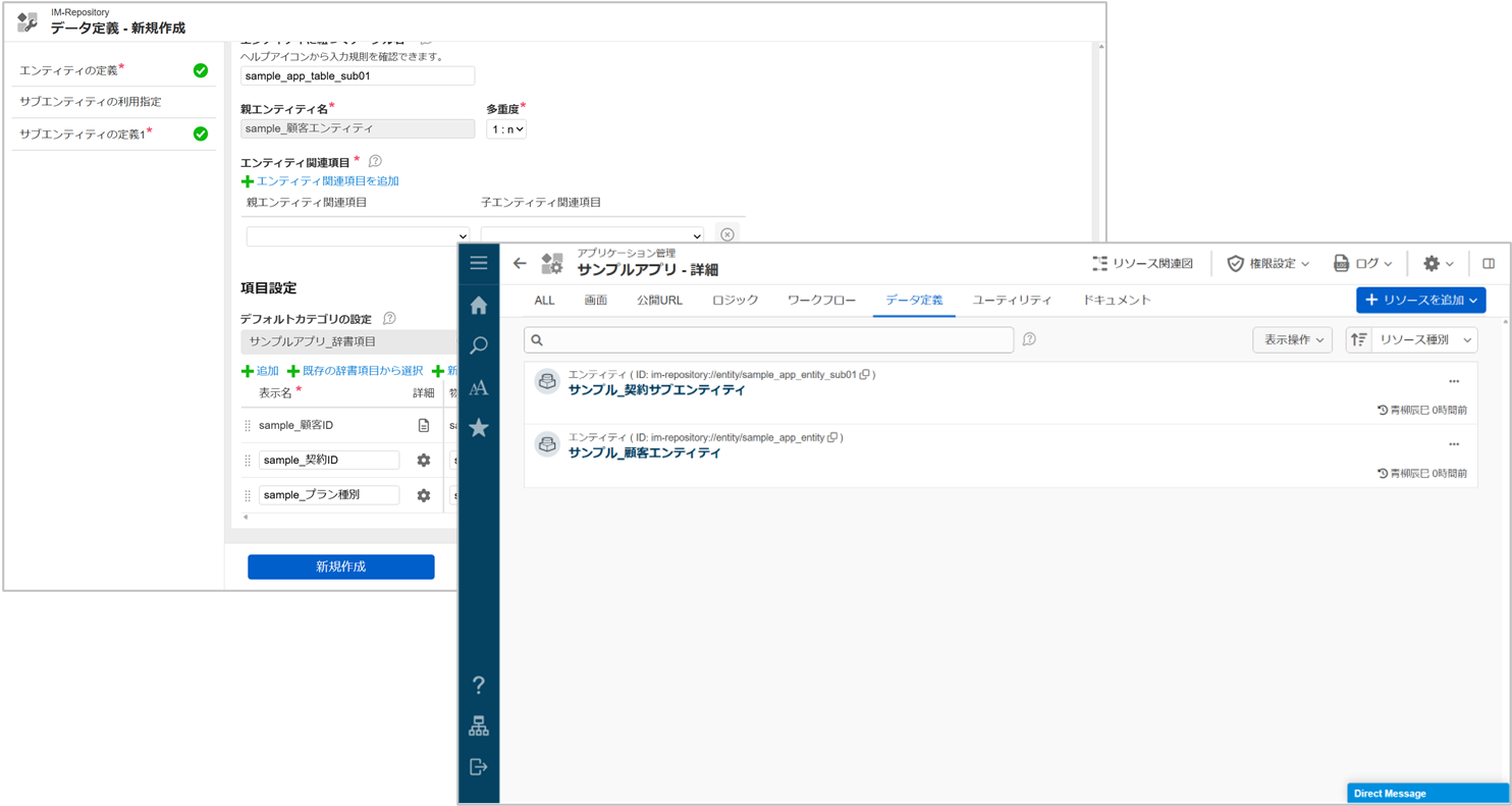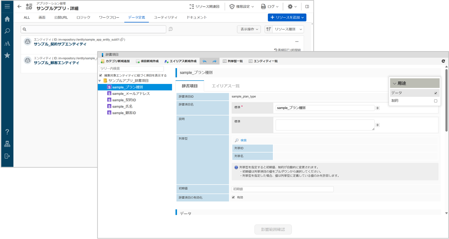 データ定義の作成では、エンティティや辞書項目など、必要なデータを設定することで、アプリケーションに「データ定義」リソースとして追加されます。