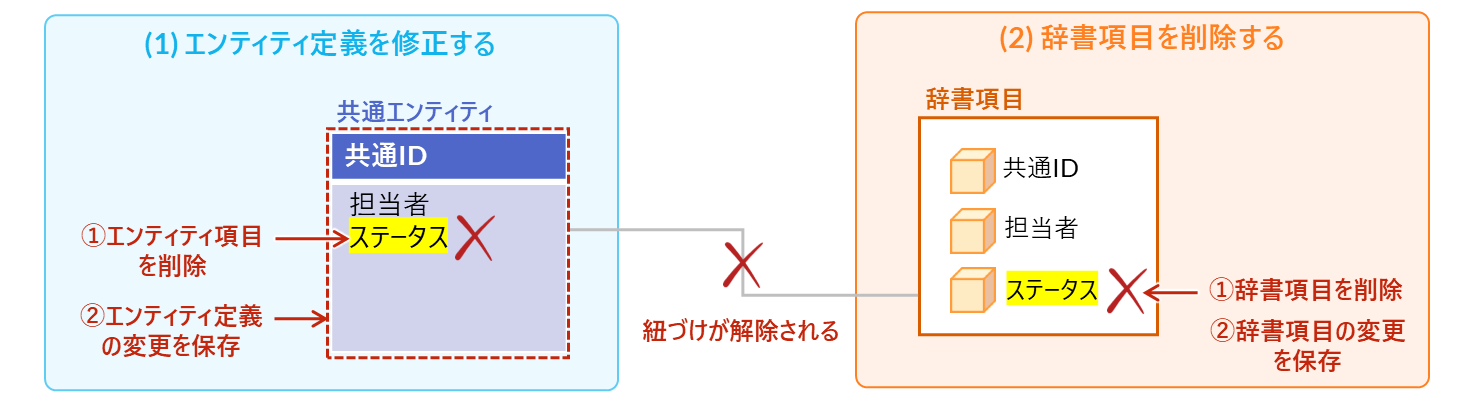 該当する辞書項目が紐づいているエンティティ項目を削除します。