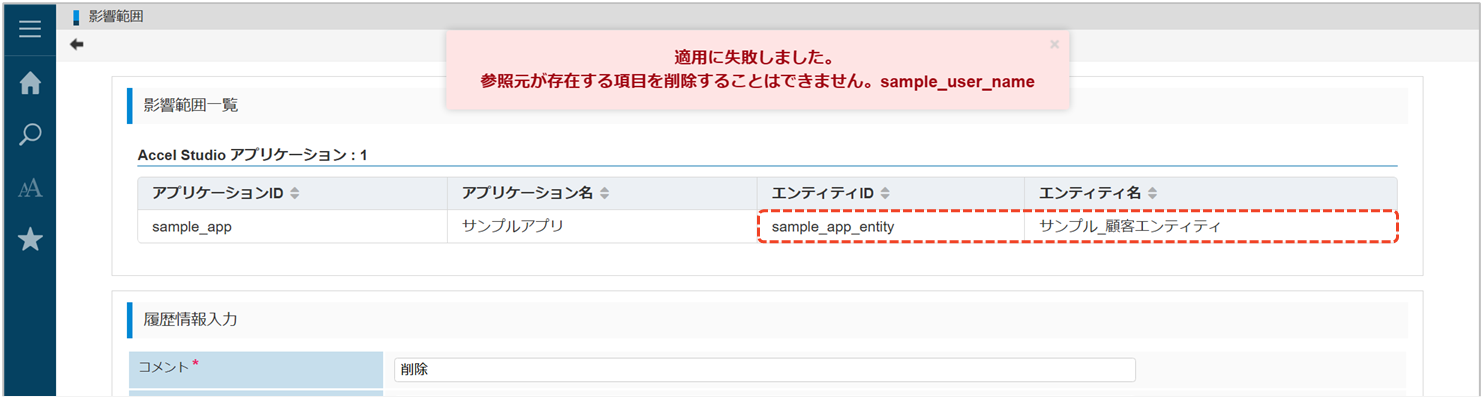 削除対象の辞書項目がエンティティから参照されている場合は、「適用に失敗しました。参照元が存在する項目を削除することはできません。」というエラーメッセージが表示されます。「影響範囲一覧」に表示されているエンティティ定義を確認し、エンティティ項目を削除してください。