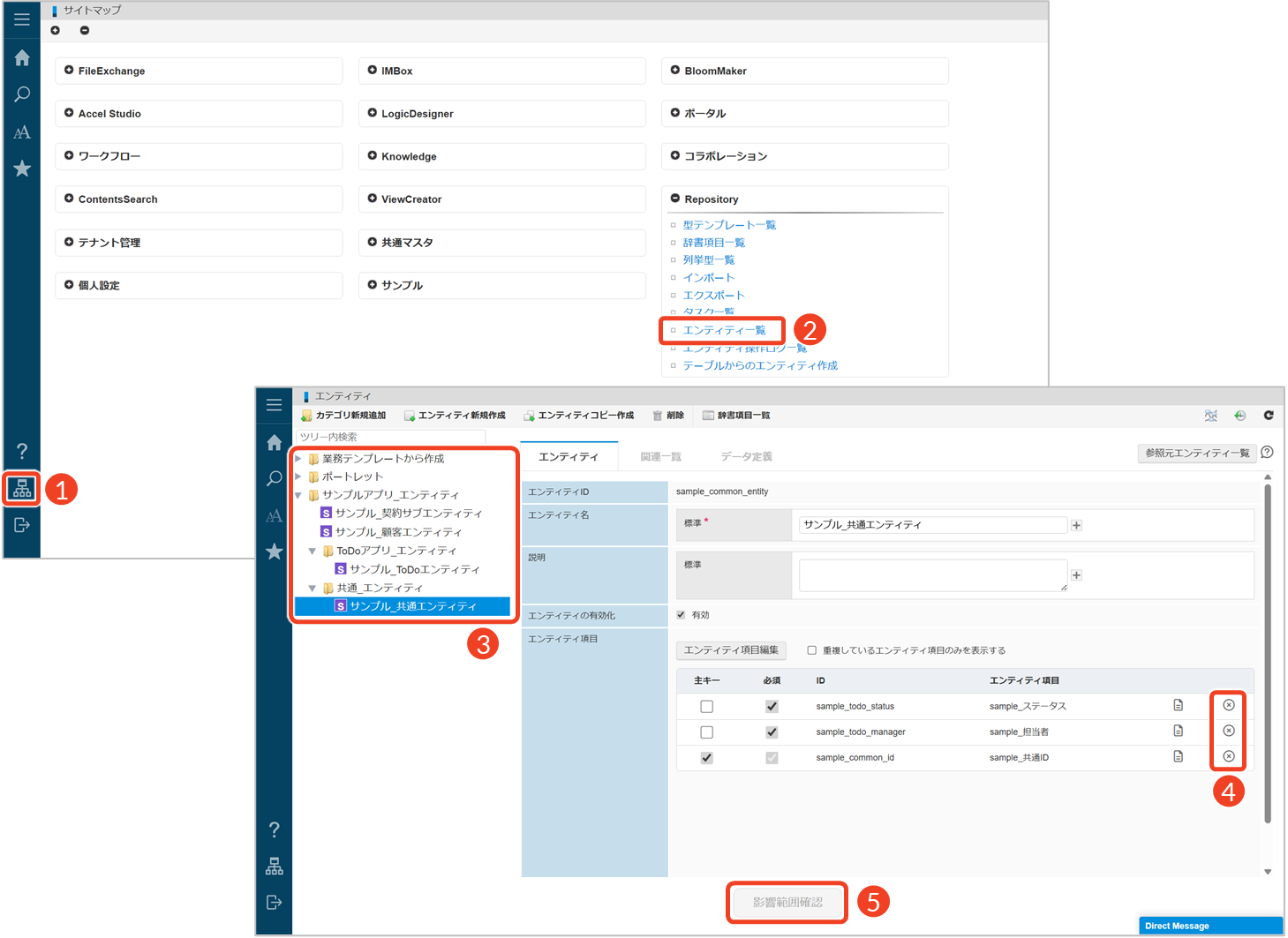 └ サイトマップが表示されます。 - 「Repository」内にある[エンティティ一覧]をクリックします。