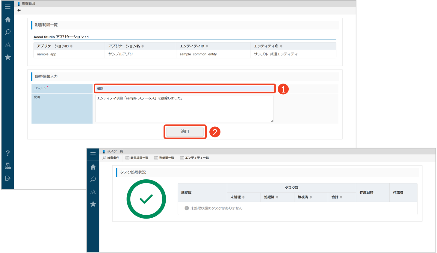 エンティティの編集が終了した後は、必ず影響範囲を確認してください。影響範囲の確認を行わないと、変更内容が保存されません。