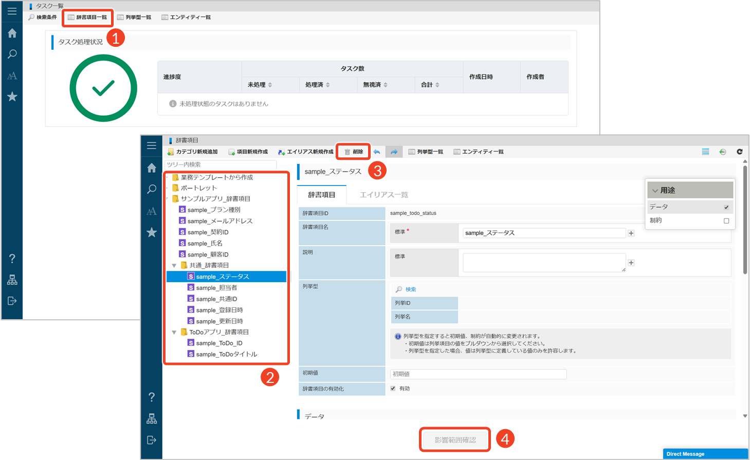 └ 「辞書項目」画面から表示が消えます。 - [影響範囲確認]をクリックします。