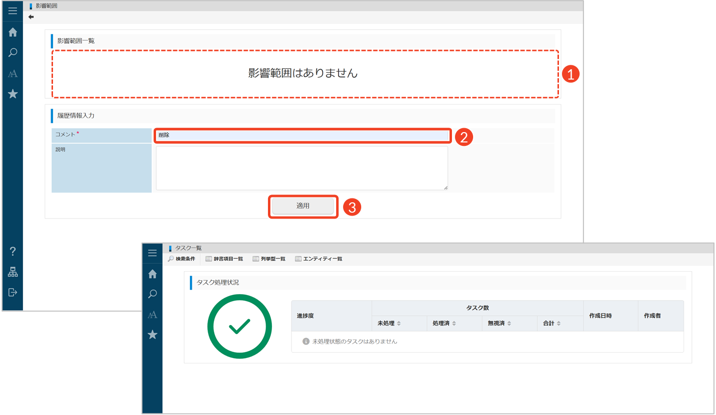 └ 「削除確認」ダイアログで[決定]をクリックします。 - [影響範囲確認]をクリックします。