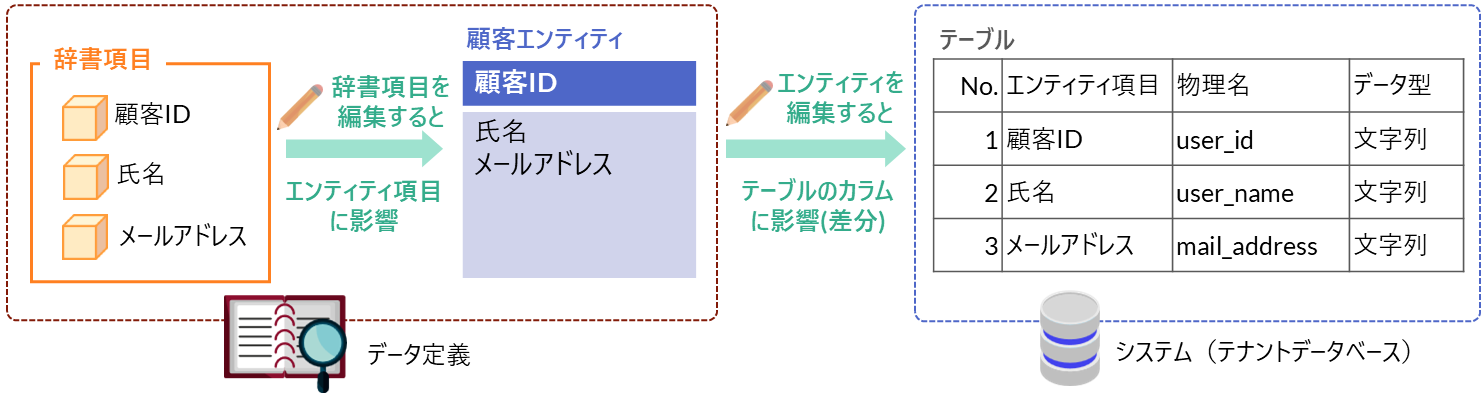 データを編集する際は、辞書項目とエンティティ(サブエンティティを含む)との関係を正しく理解しておくことが大切です。新規でデータ定義を作成する際、辞書項目とエンティティをあわせて設定します。これにより、設定した辞書項目がエンティティ項目として反映され、その内容をもとにテーブル構造(カラム)が自動的に作成されます。