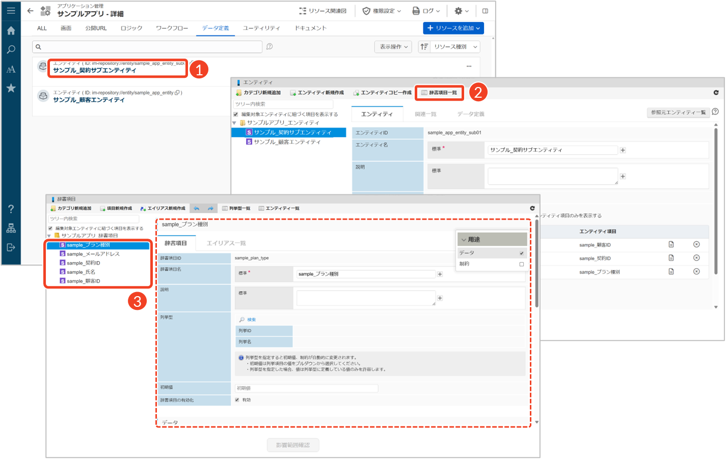 辞書項目と列挙型の利用方法については、「intra-mart Developer Portal - 辞書項目の設定を使い分けるコツ」を参照してください。