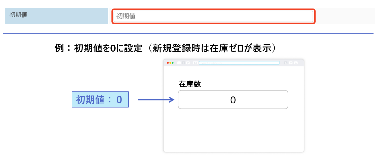 たとえば、商品登録において在庫数の初期値を「0」とすることで、ユーザは新規登録時に値を入力せずに済みます。
