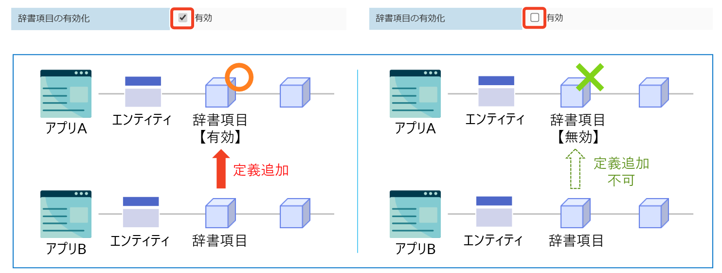 辞書項目は、初期状態で「有効」に設定されています。有効にすると、アプリケーション内で辞書項目が利用でき、さらに他のアプリケーションから定義を追加することも可能です。