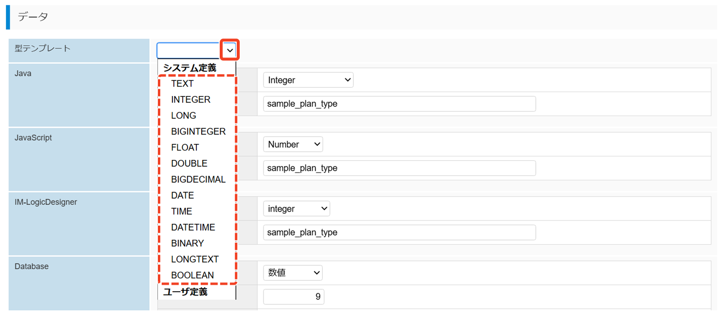 型テンプレートは、一般的に使用されるデータ型の設定を標準化したもので、Database・Java・JavaScript・IM-LogicDesignerなど、複数の環境に対応しています。これを利用することで、データ型の変更や更新を効率的に行いながら、一貫性を確保することが可能になります。