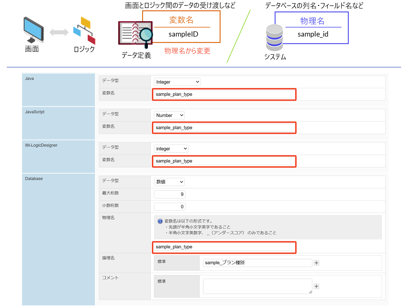 必要に応じて、Java・JavaScript・IM-LogicDesignerの変数名やDatabaseの物理名を変更してください。