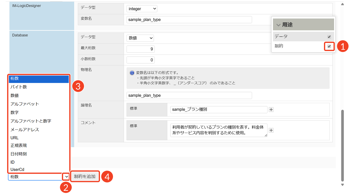 設定名 項目 用途 Database設定 データ型、最大桁数、小数桁数、物理名、論理名、コメント 実際に生成されるデータベースのテーブル・カラム定義に使用されます。スキーマ設計に沿って、データの整合性を保つ役割を果たします。