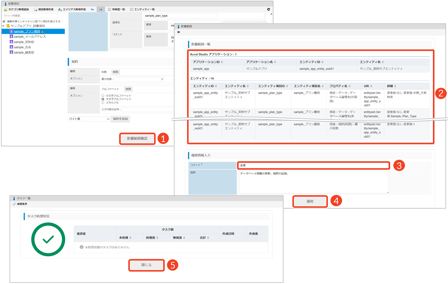 └ 辞書項目の変更がエンティティに及ぼす影響を確認してください。 - 「コメント」に変更理由を入力します。