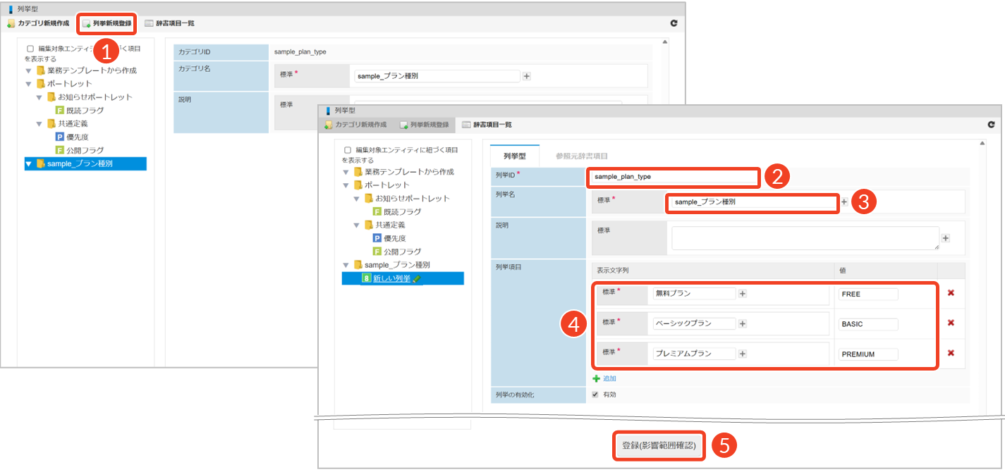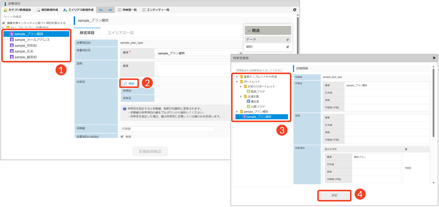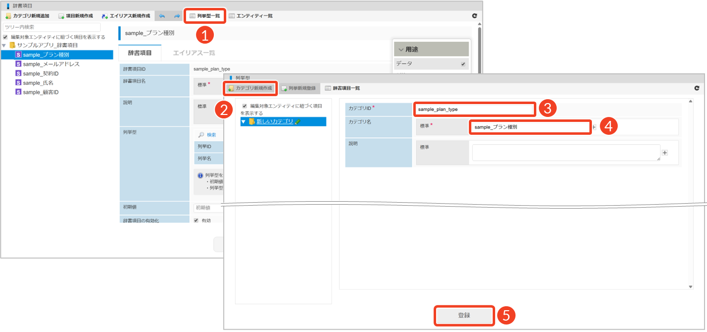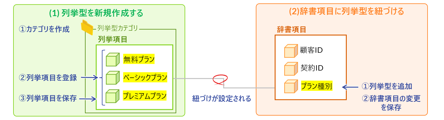 列挙型を利用する場合は、まず列挙型を格納するカテゴリを用意し、その中に必要な列挙項目を登録します。次に、対象となる辞書項目に列挙型を追加することで、辞書項目と列挙型が紐づけられます。