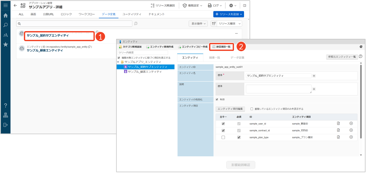 └ 「エンティティ」画面が表示されます。 - [辞書項目一覧]をクリックします。