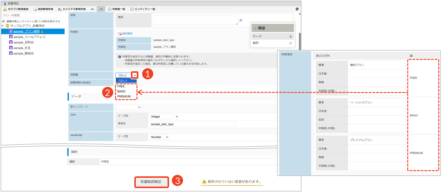 列挙型の編集が終了した後は、必ず影響範囲を確認してください。影響範囲の確認を行わないと、変更内容が保存されません。