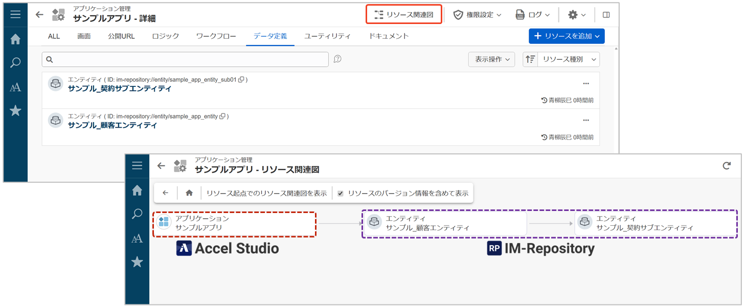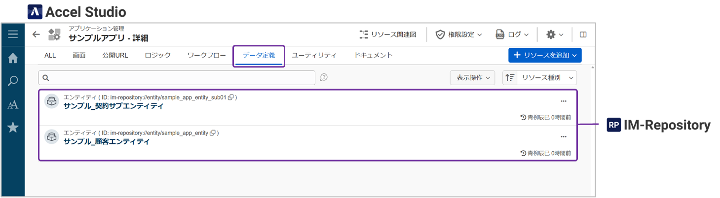Accel Studioにおける「データ定義」リソースとは、IM-Repositoryで定義したエンティティなどの情報を管理するカテゴリを指します。リソースをアプリケーションに追加することで、自動的に関連付けが行われ、アプリケーション内で利用できるようになります。