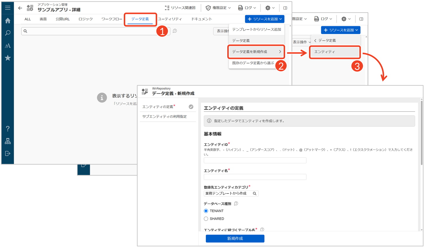 「データ定義」リソースにエンティティを追加する際の基本的な操作について説明します。
