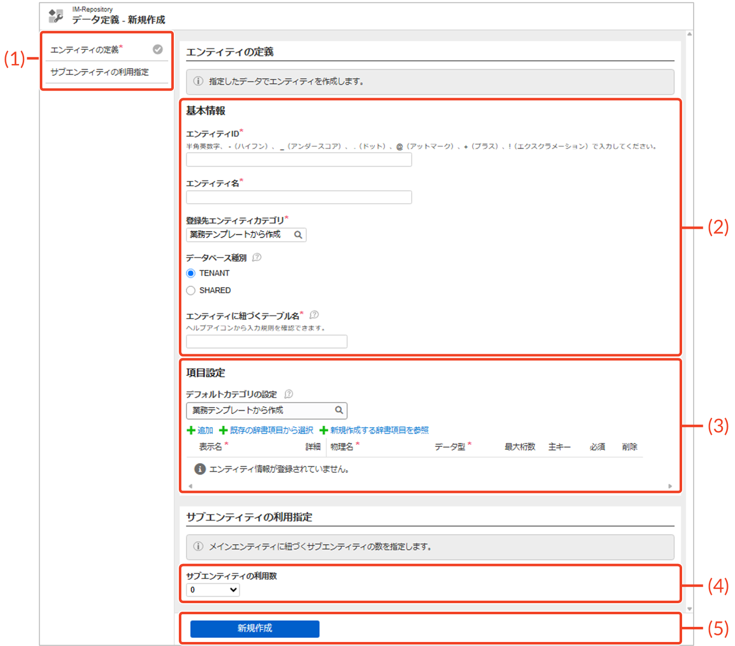 | (4) | サブエンティティの利用指定 | サブエンティティの利用数 | サブエンティティの利用数を選択します。利用数を「1」以上に設定すると、その数に応じた設定項目がページの下に自動で表示されます。 |
