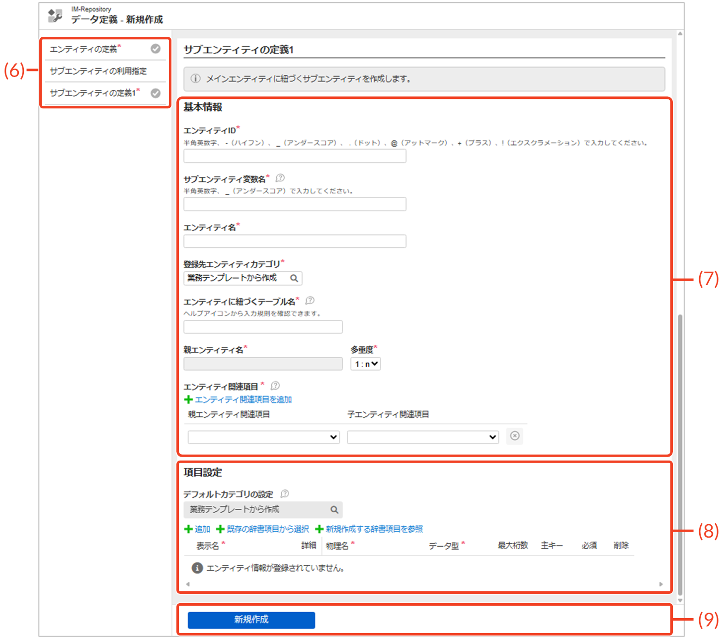 | (7) | サブエンティティの定義 | 基本情報 | サブエンティティの基本情報と、親となるメインエンティティとの関連情報を設定します。 |