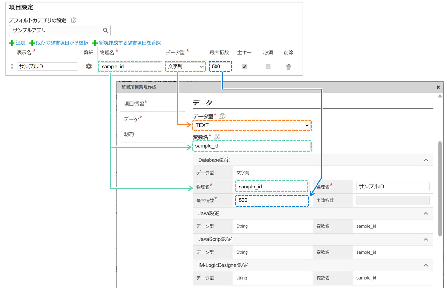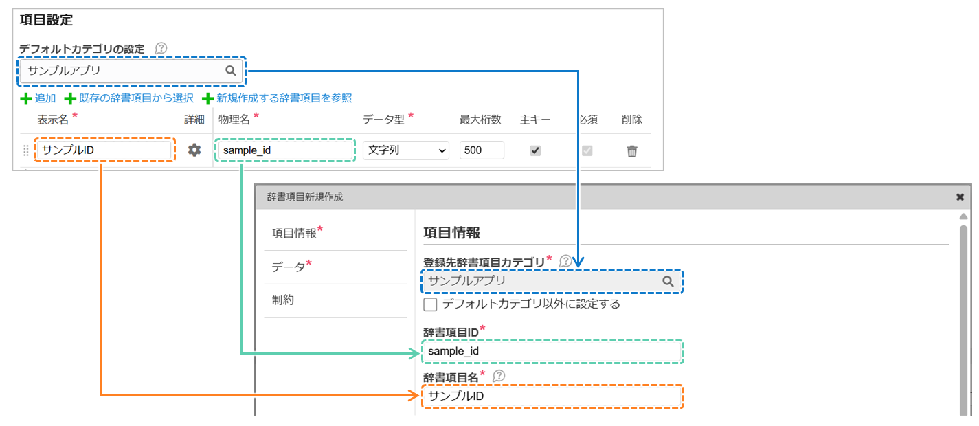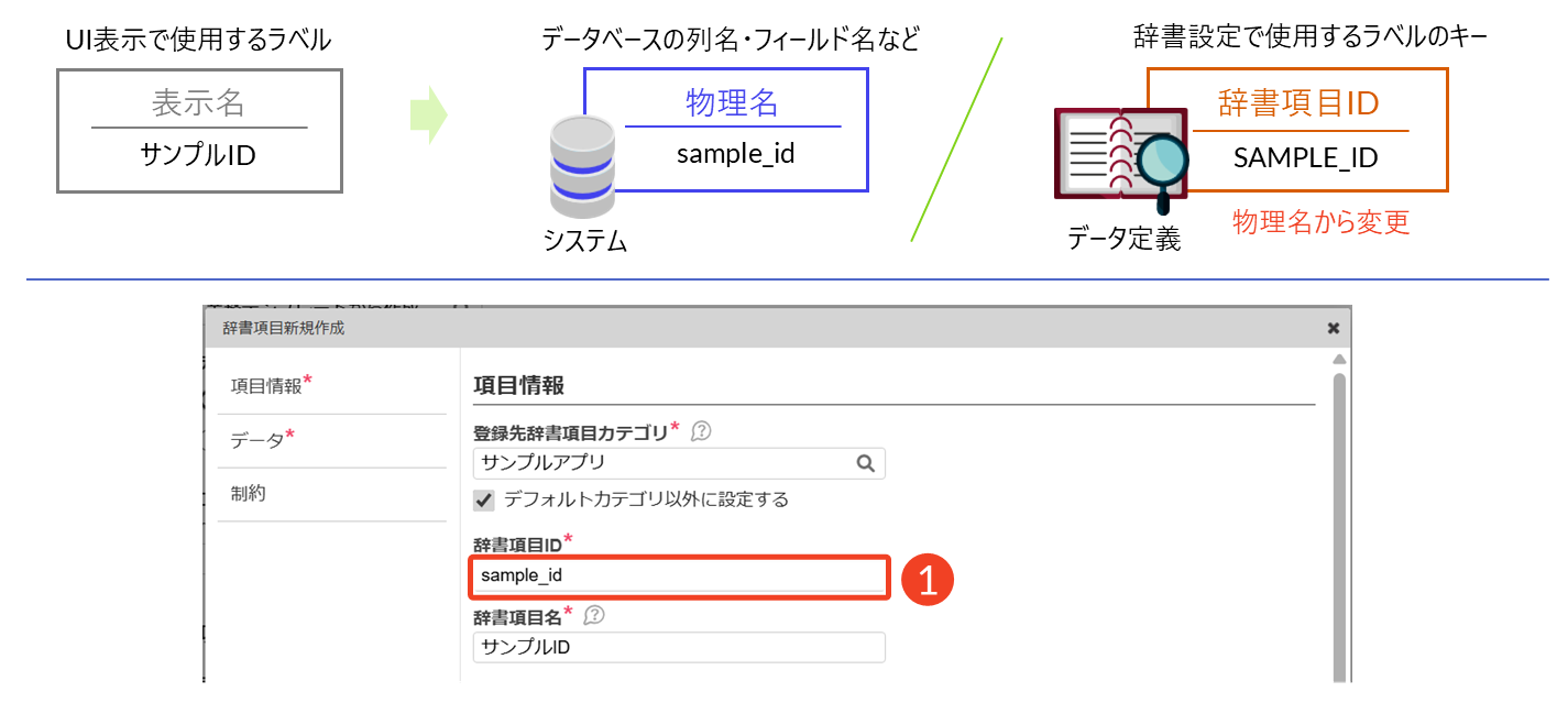 たとえば「サンプルID」という項目を作成した場合、初期状態では物理名sample_idが辞書項目IDにも自動反映されますが、必要に応じて辞書項目IDをSAMPLE_IDといった形式に変更することも可能です。