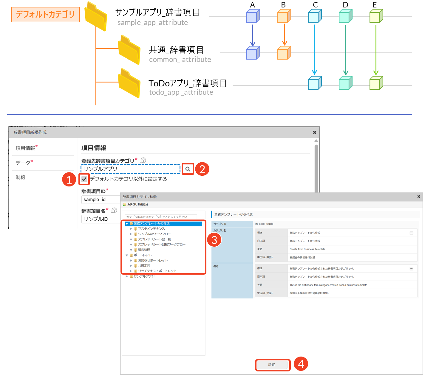 - 辞書項目の情報を変更する:作成中の辞書項目に対して、カテゴリやID・名称を変更