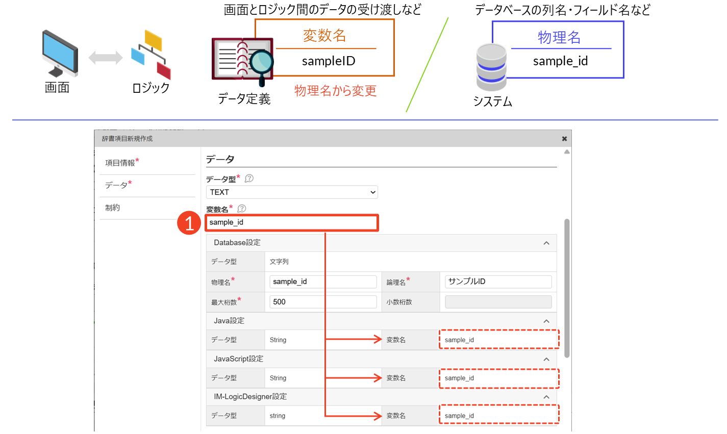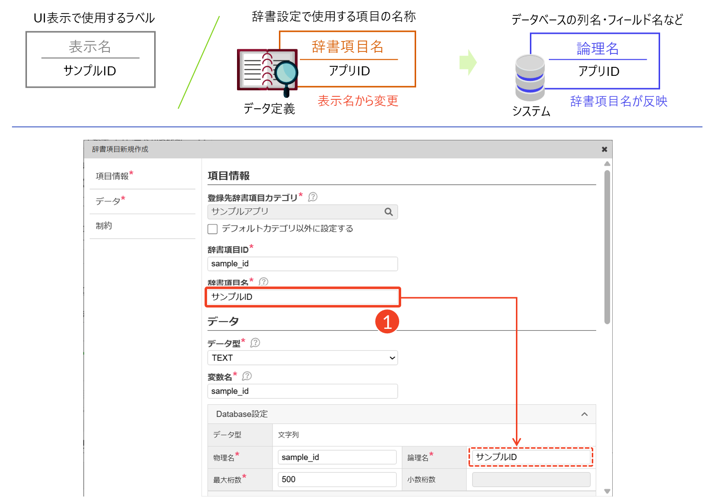 アプリケーション内での扱いやすさや命名規約を考慮し、辞書項目IDを物理名とは異なる名称に変更できます。