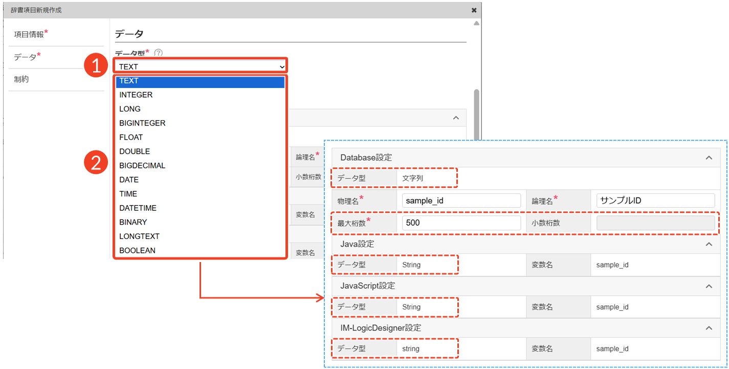 JavaScript設定 データ型、変数名 フロントエンド側で扱うJavaScript変数名やデータ型として反映されます。画面項目とのバインディングにも利用され、データ整合性を保ちます。