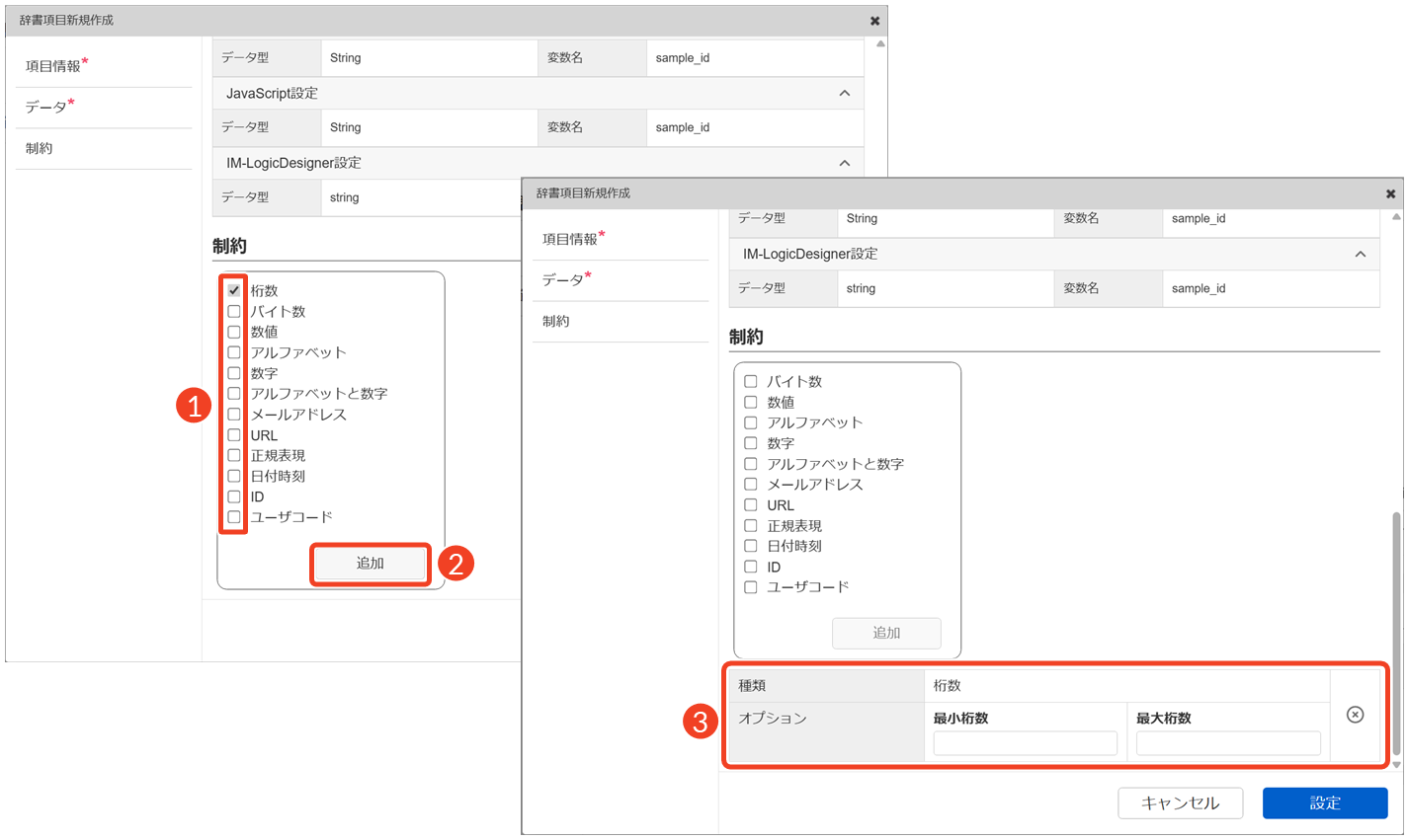 「桁数」制約とは、入力される文字列の桁数を制限するための設定です。入力欄には、用途に合わせて次の内容を定義します。
