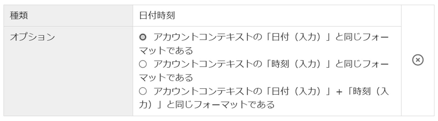 - アカウントコンテキストの「日付(入力)」+「時刻(入力)」と同じフォーマットである