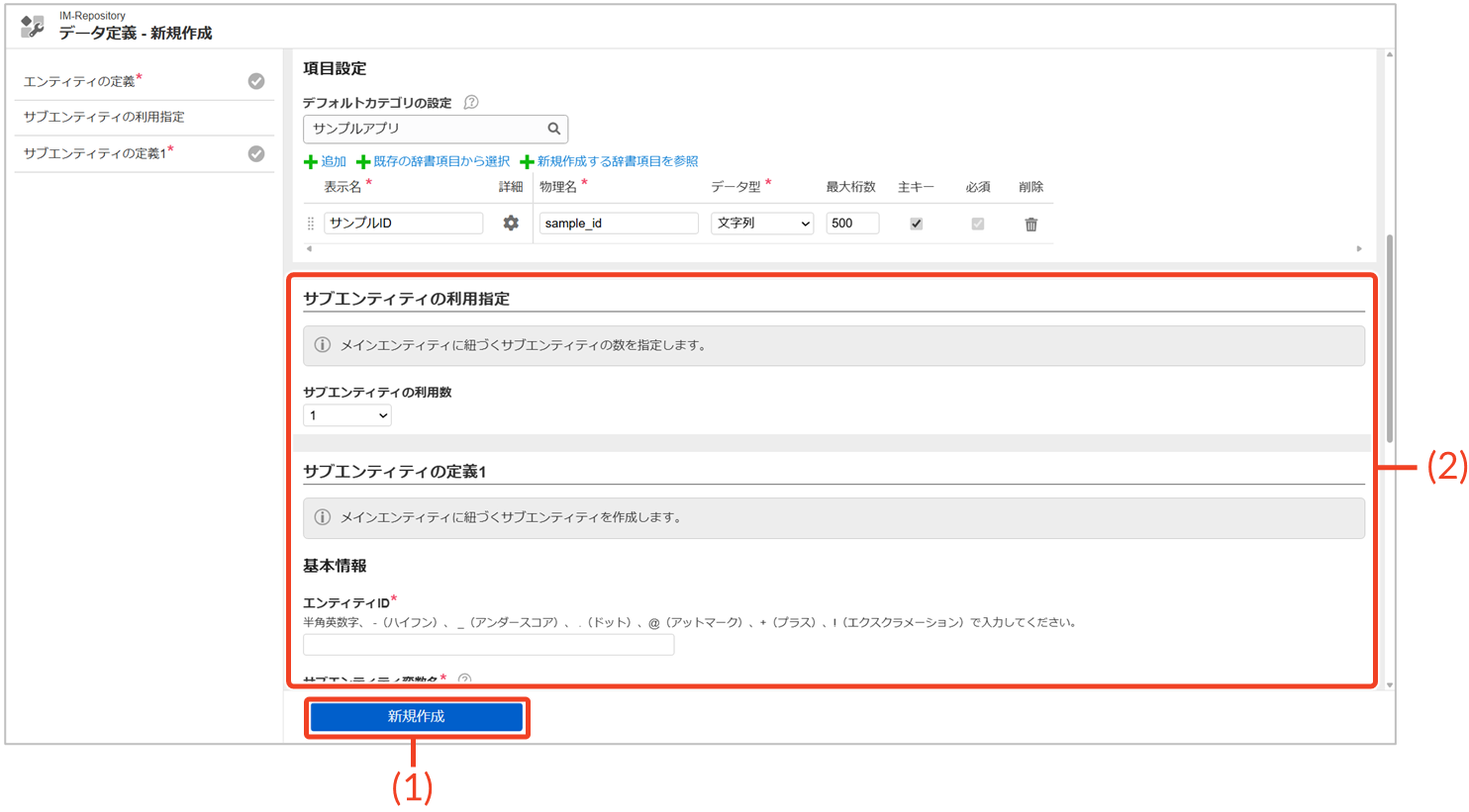 サブエンティティを設定せずにエンティティの設定を完了する場合は、[新規作成]をクリックしてください。