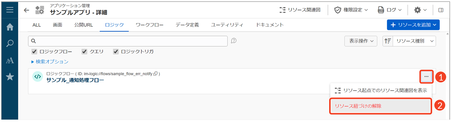 この操作では、リソースのデータ自体は削除されないため、影響範囲を考慮する必要がある場合に有効です。また、ロジックフローを保持することで、他のアプリケーションでの再利用も可能となります。