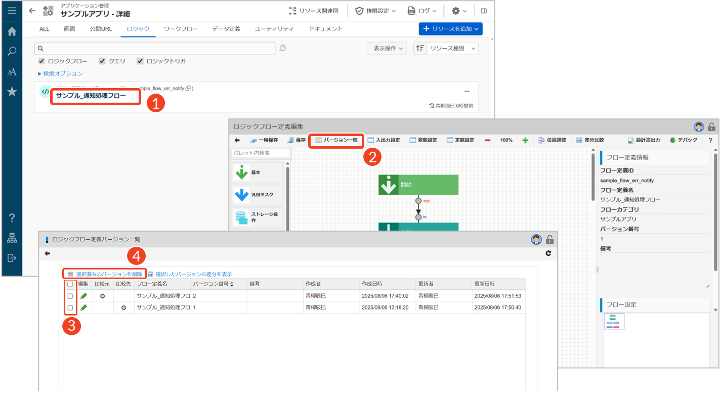 ロジックフロー定義に登録されているすべてのバージョンをまとめて削除します。 - 特定のバージョンのみ削除する