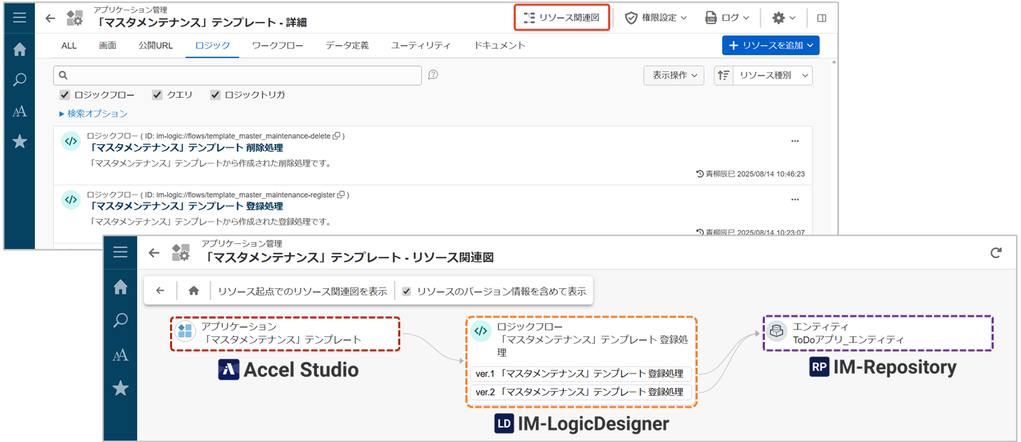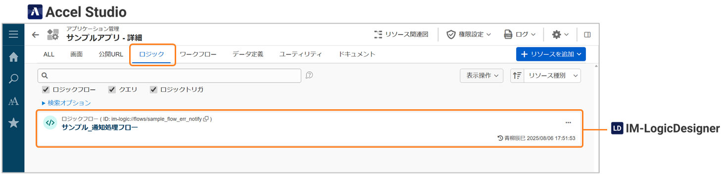 Accel Studioにおける「ロジック」リソースとは、IM-LogicDesignerで作成したビジネスロジックやViewCreatorで作成したクエリを構成するリソースを管理するカテゴリのことです。リソースをアプリケーションに追加することで、自動的に関連付けが行われ、アプリケーション内で利用できるようになります。