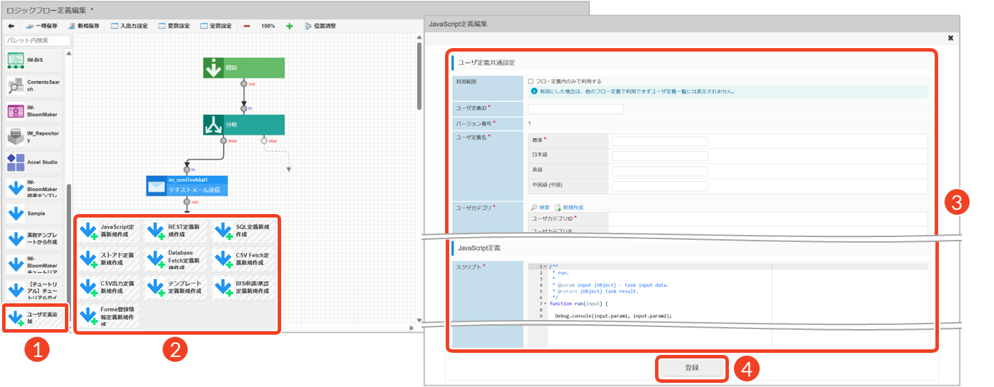 ユーザ定義編集 - JavaScriptの仕様について、詳細は、「IM-LogicDesigner仕様書 - 4.2.5.1.1. JavaScript」を参照してください。