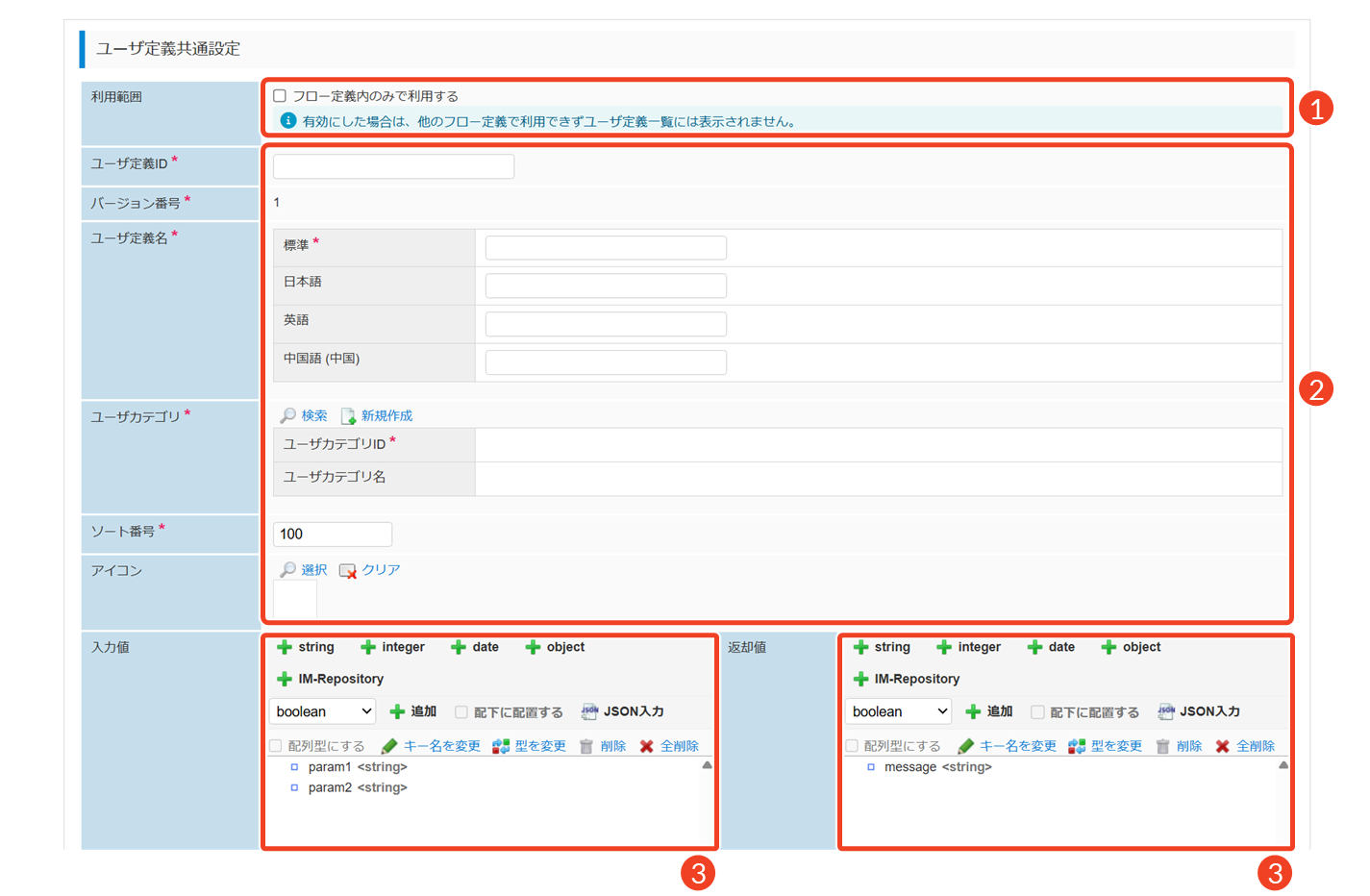 ユーザ定義編集 - RESTの仕様について、詳細は、「IM-LogicDesigner仕様書 - 4.2.5.1.2. REST」を参照してください。