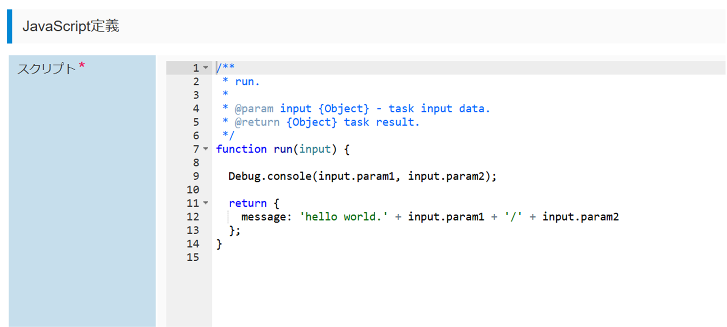 「JavaScript定義」では、JavaScriptを使って実行処理を記述します。スクリプトでは次の内容を定義します。