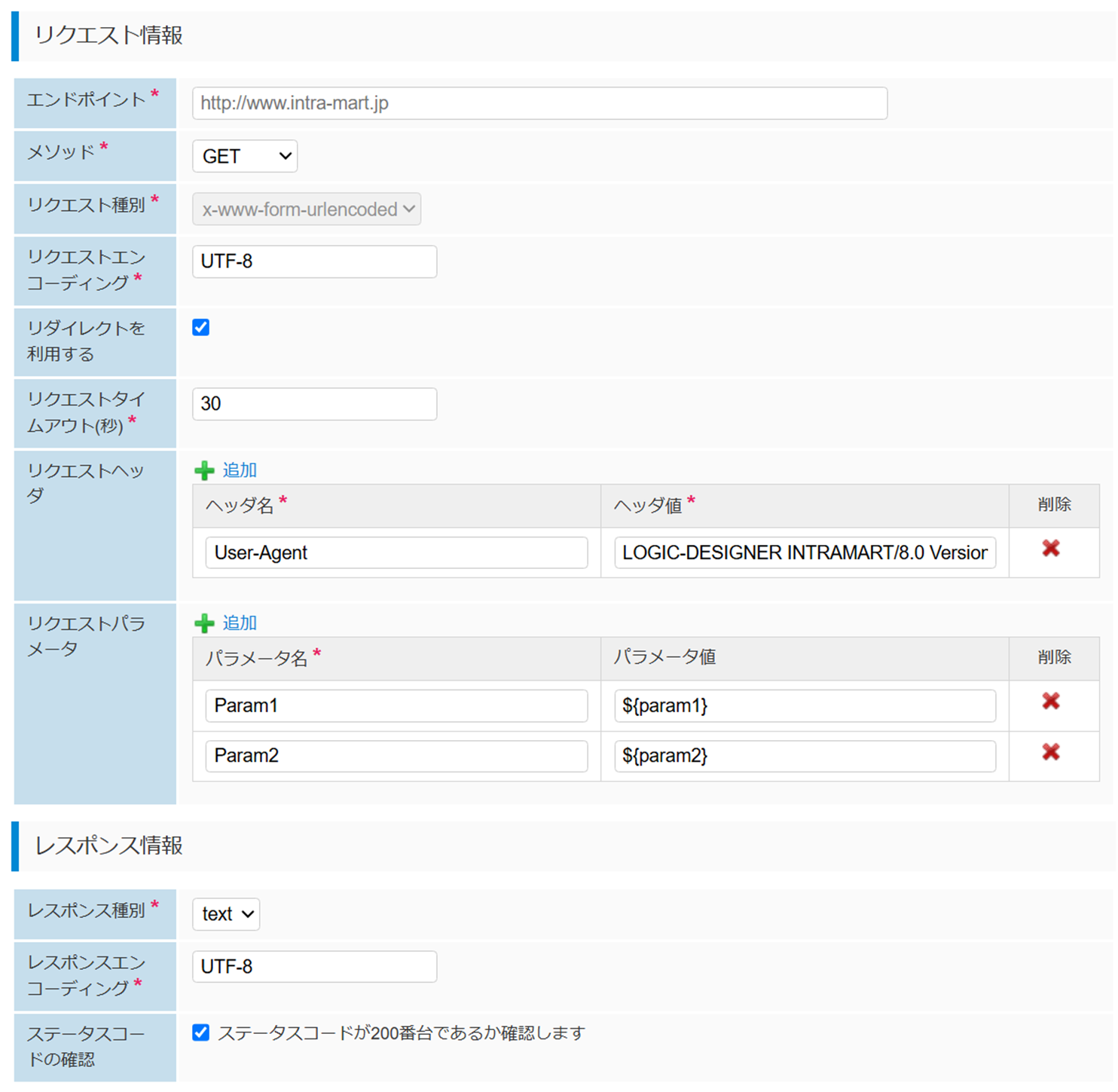- 必要に応じて、リクエストエンコーディング、リクエストヘッダ、リクエストパラメータ、タイムアウト、リダイレクト可否を設定