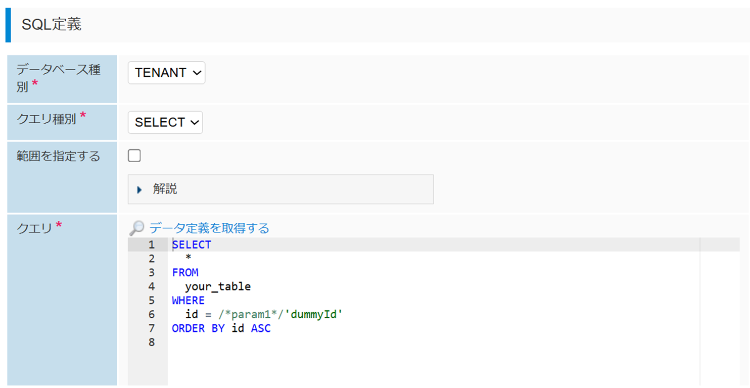 「SQL定義」では、2WaySQLを使って、データベースに関する処理を記述します。