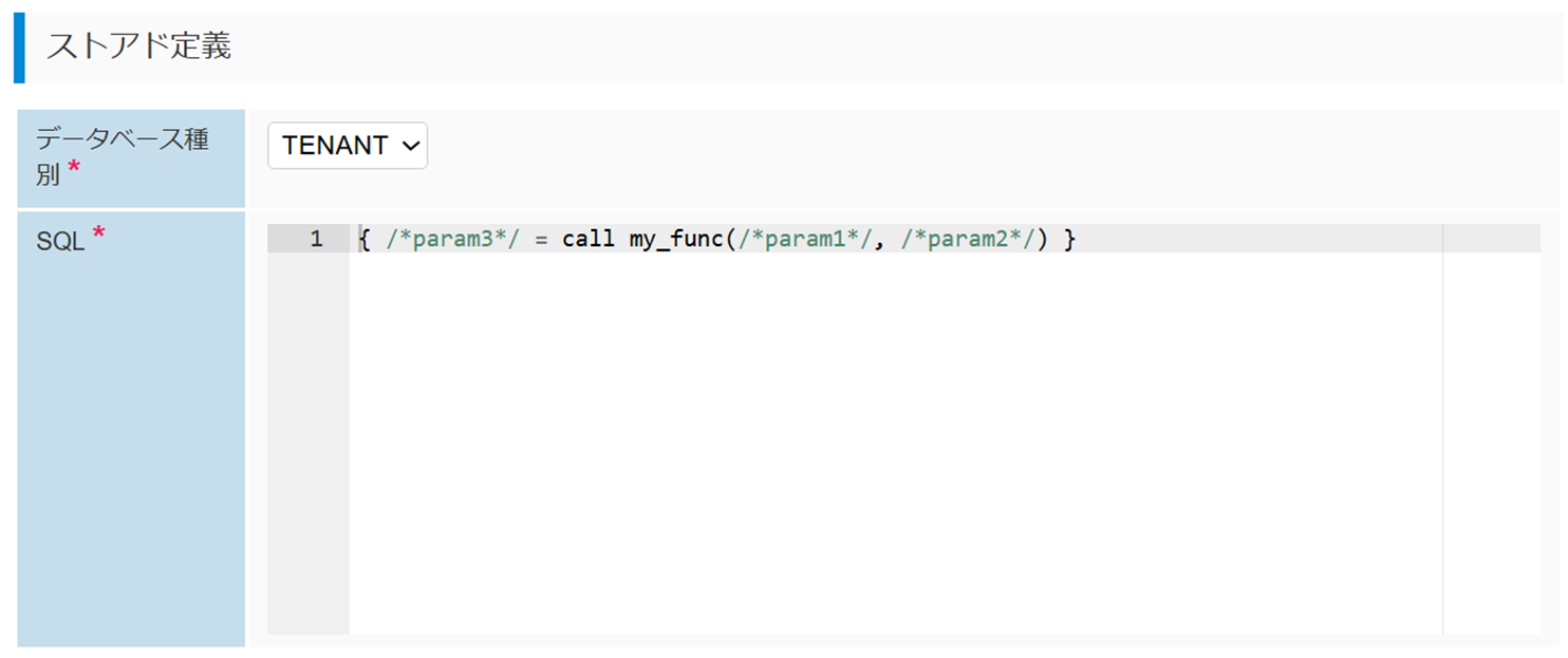 「ストアド定義」では、2WaySQLを使って、データベース内で事前に定義されたストアドプロシージャ*1やストアドファンクション*2を実行するための処理を記述します。